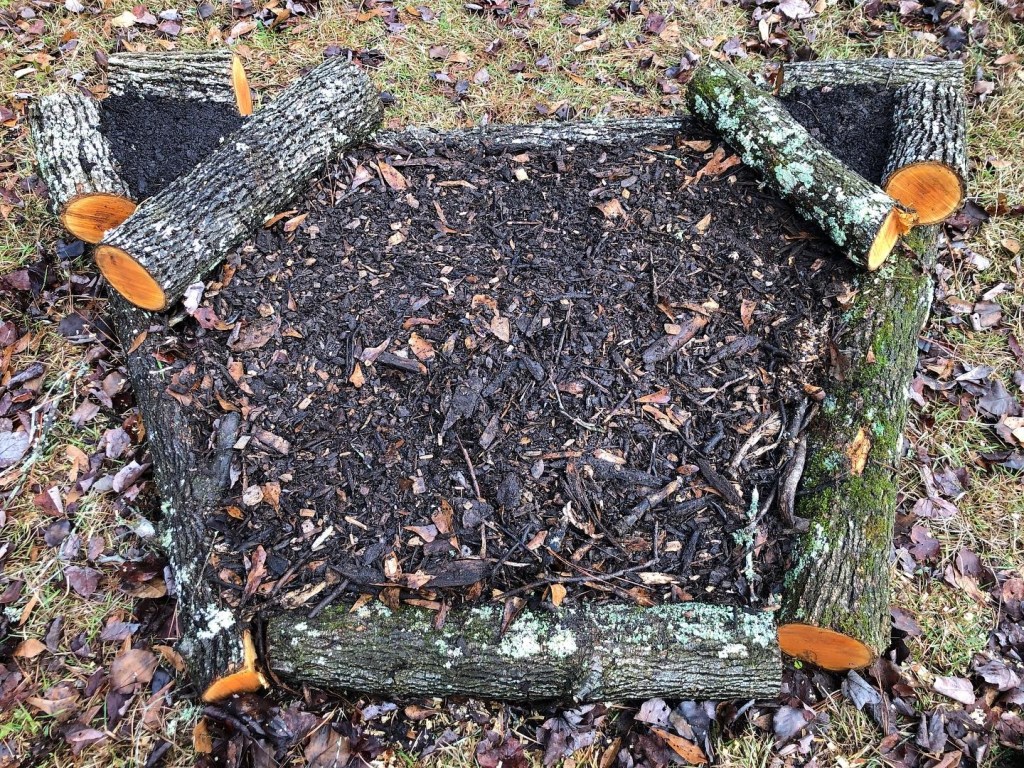 This tree stump and twigs will feed this flowerbed for years. I covered up the stump and twigs with rotting wood chips and will use topsoil when planting in spring.