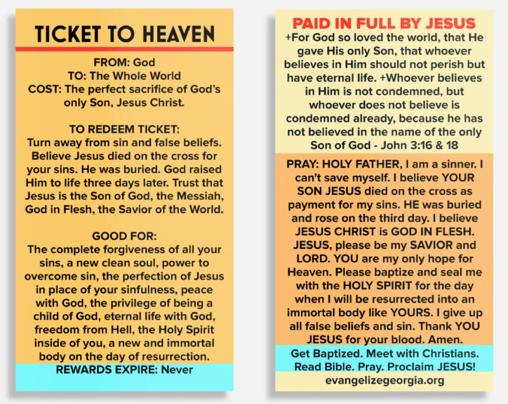 -Simple Gospel presentation in the form of a ticket.