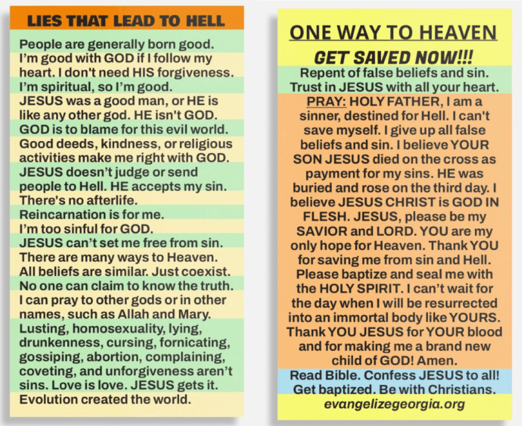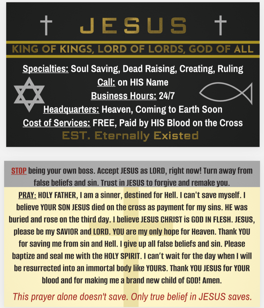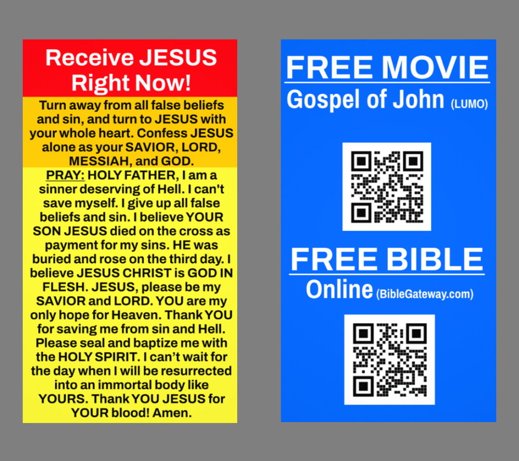 FREE BIBLE – FREE GOSPEL MOVIE – SINNER’S PRAYER (Business-card Tract)