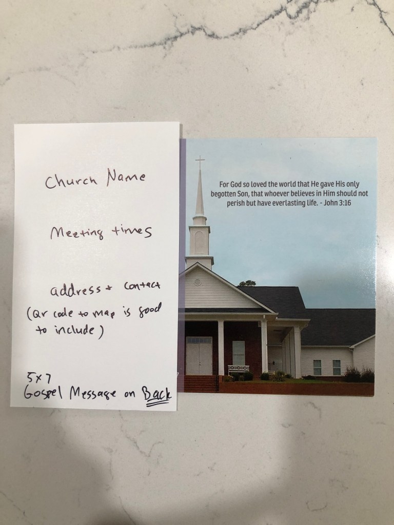 I also use the 5X7 gospel message to make Gospel postcards that advertise my Church. For those, I put a picture of the church on the front of the postcard, along with meeting times.