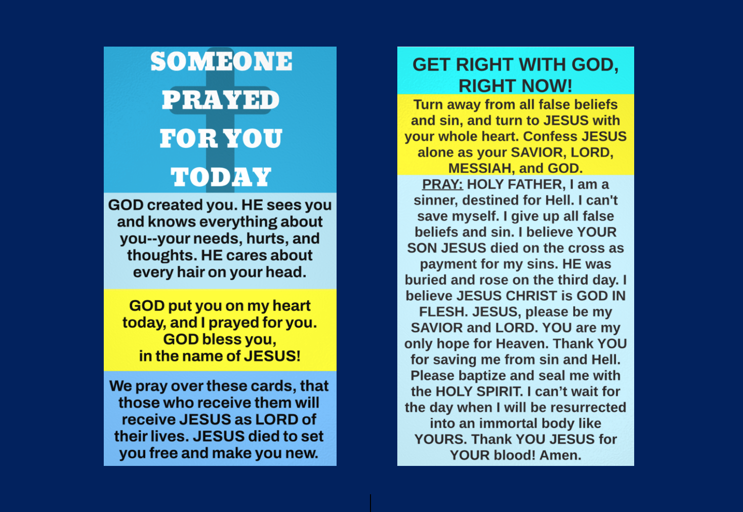 We pray over these cards, that those who receive them will receive JESUS as the LORD of their lives. JESUS died to set you free and give you a new life.