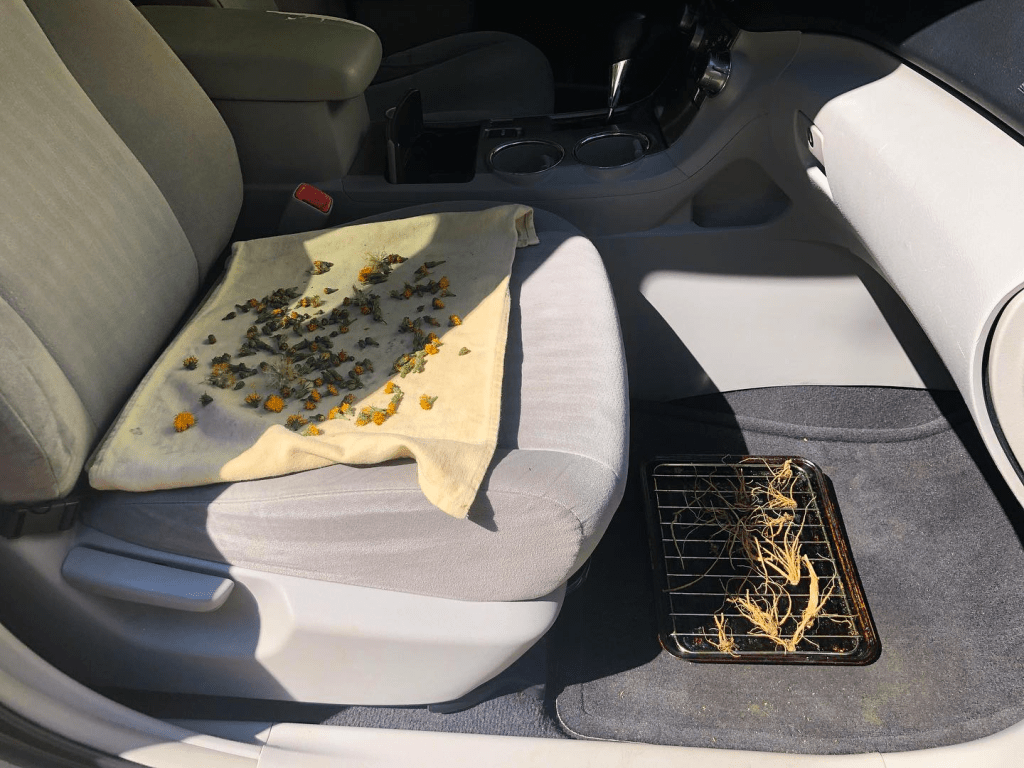 Instead of buying a fancy food dehydrator, I’ve been loading trays into my car and parking in the sun. I try not to put the food and herbs in direct sunlight, especially if the herbs are delicate.