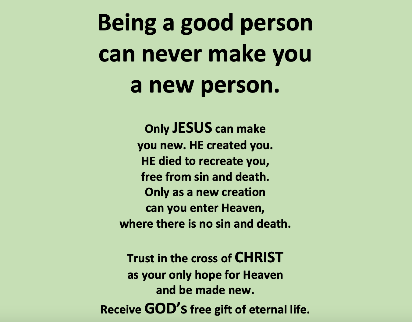 We cannot take away our own sins. No human can forgive our sins. Our good deeds will never outweigh our bad ones. Being kind is good, but kindness can’t pay for sin or make our bodies free of death. Being a good person can never make you a new person.